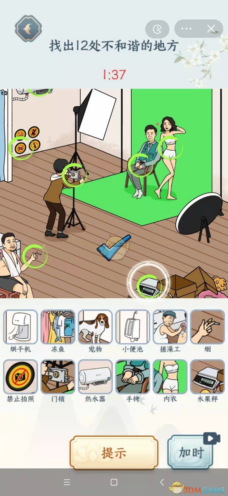找茬文字是一个以文字、解谜、找茬为主要元素的小游戏。如何在工作室里挑词?这一关需要找到工作室里12个不和谐的地方,也就是不应该出现在这里的东西。答案是干衣机、禁止拍照、冻鱼、门锁、宠物、热水器、小便池、洗澡工、内衣、手铐和水果秤。不知道《文字来找茬》找茬摄影棚找出12处不和谐的地方通关攻略图文的,看看接下来的介绍吧!