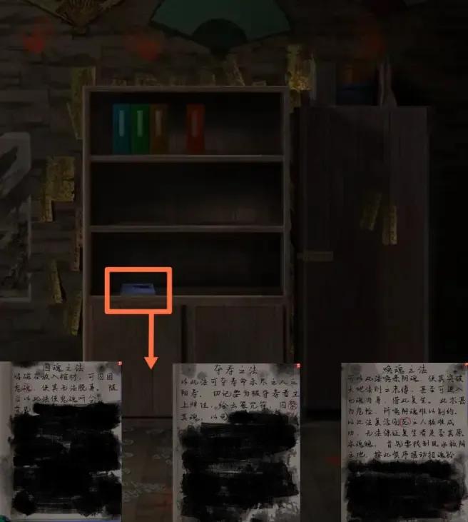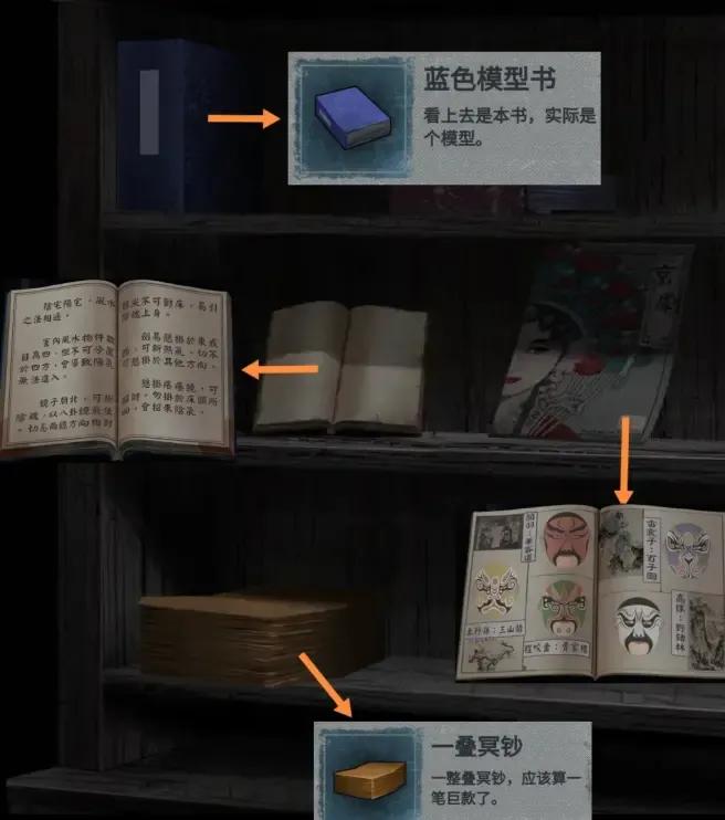 到达裹尸布店后,点击右边的书架,可以获得鬼笔记和蓝色模型书,还可以查看风水和脸书的线索。