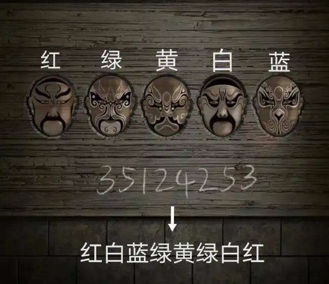 面膜机构上有一串数字,对应着脸妆的颜色,分别是红、白、蓝、绿、黄、绿、白、红。按此顺序按对应颜色的脸妆。从左到右,它们是红、绿、黄、白、蓝。