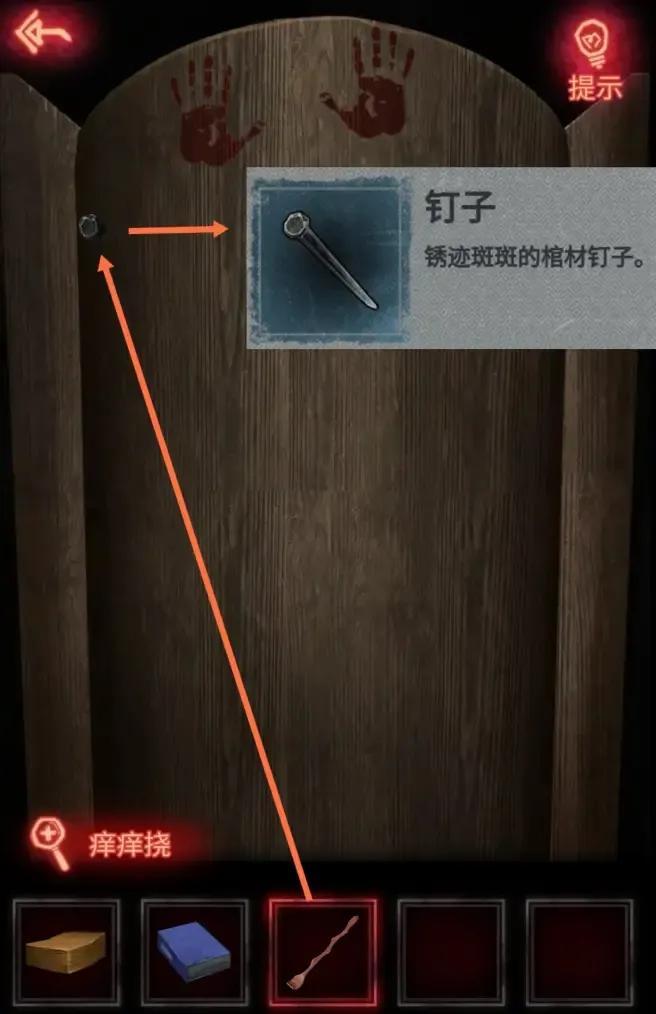 前往裹尸布店左侧的房间,点击棺材,使用痒痒去除钉子,获得钉子。