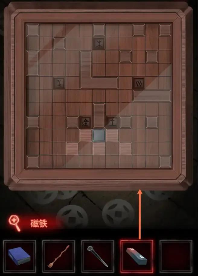 到地下室左侧的房间,点击右下角的箱子,把磁铁放在箱子上,就可以移动箱子里的木块,把剩下的木块推到五个区域。这个过程就不再演示了,本质上就是推箱子。