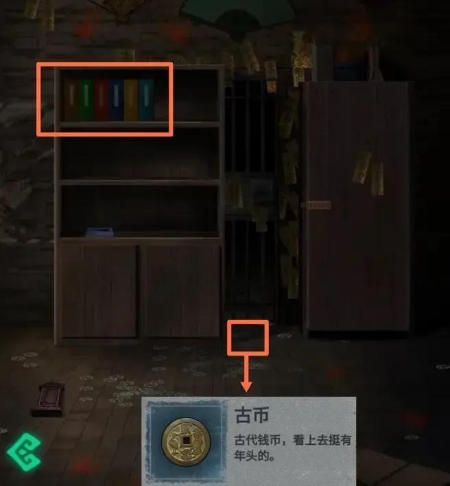 放置完毕后,书架会移动一半。书架和柜子之间的地上有一枚古钱币。捡起来就可以得到它。