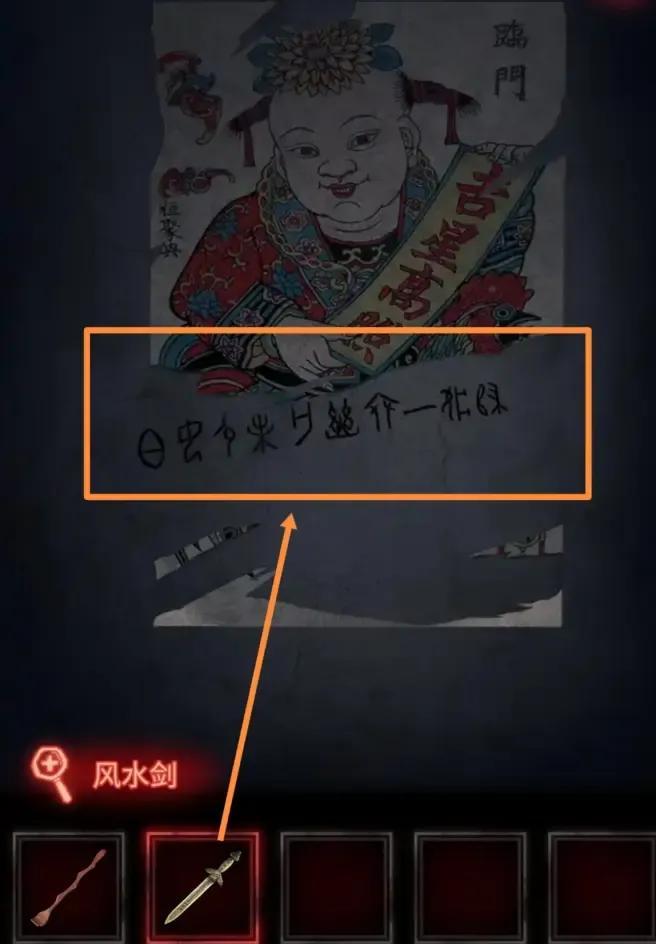 进入寿衣店右侧的房间,用风水剑打开年画,会看到一串特殊的字符。