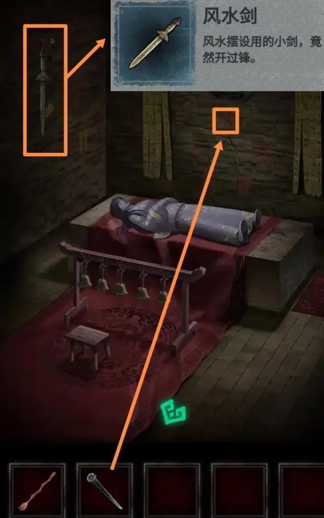 密码解锁后,即可进入关押莫琪的暗室。点击墙上的剑即可获得风水剑,并将钉子钉在镜子下面。