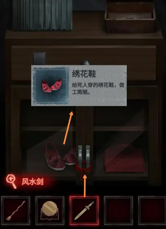 去寿衣店左边的房间,用风水剑砍断柜子上的绳子,得到绣花鞋。