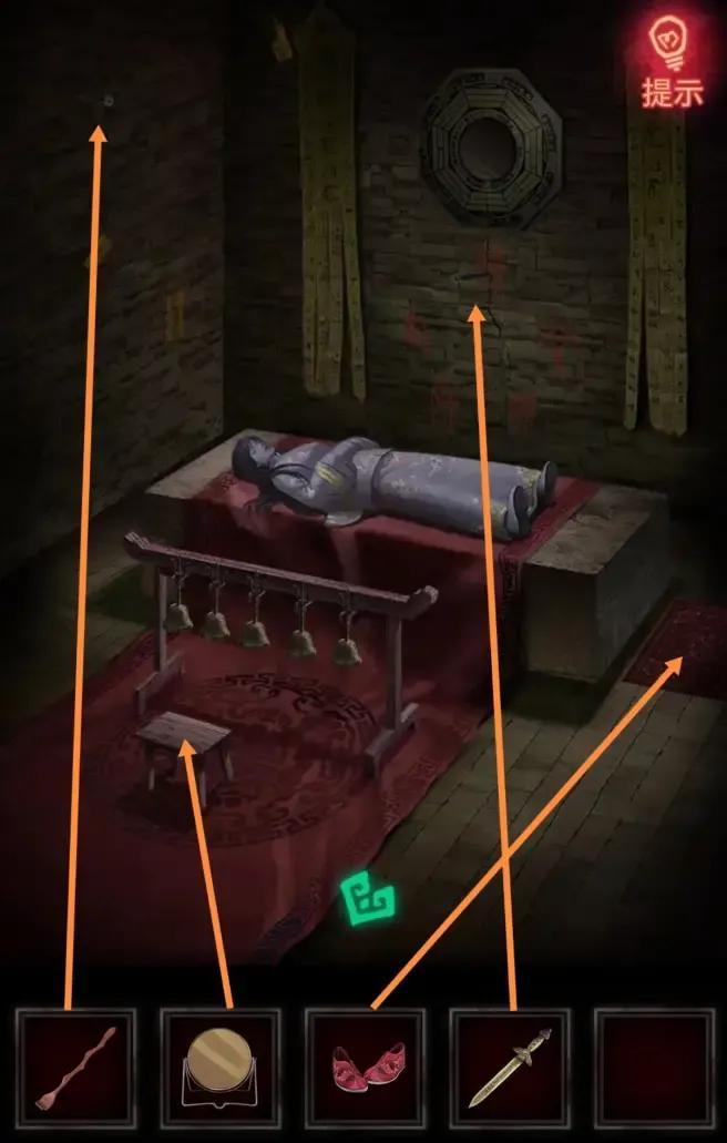 返回暗室,将四件物品放置在适当的位置,以破坏风水。把《痒痒痒》挂在左边墙上,把镜子放在凳子上,把绣花鞋放在莫奇右边的红地毯上,把风水剑挂在镜子下面。如下所示。