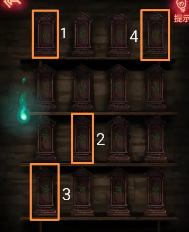 风水被破坏后,点击铃铛召唤莫奇的灵魂。根据白色皮影所指示的字符,依次敲响相应的铃铛。这个过程是随机的,不会再次显示。