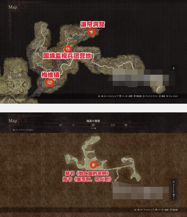 除了在边境监察团营地东北方的群青瀑布后面的水帘洞二层的宝箱里发现的还有魔法书《王国毁灭的丧钟》的禁书03(见上文) )。也可以在不知名的村庄使用假的魔法书02“雷霆爆盾”找到韦斯利(地点参考下图)作为交换。