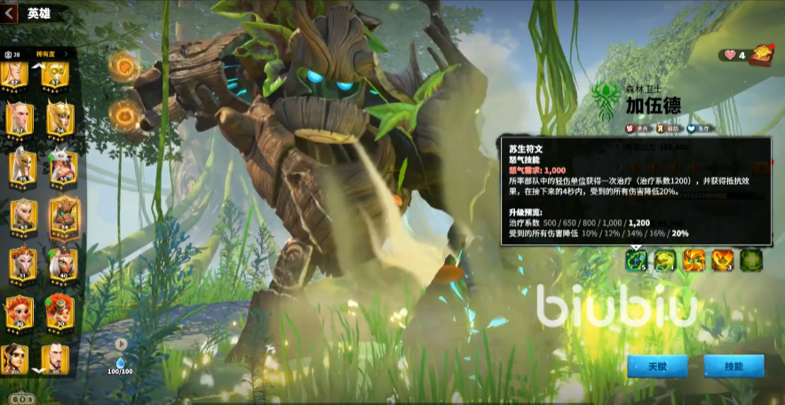 “坚硬树皮”的被动在驻守城市和据点时生效,可使驻守的所有单位生命值增加2%;第二个被动是“古树的召唤”,可以使所率领的步兵单位的生命值和防御力提高10%,同时获得的治疗效果也提高10%。