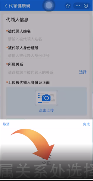 第三步:输入代收人信息,在隶属关系部分选择父母,然后点击上传“代收人身份证正面”照片,然后点击确认添加即可采集成功。