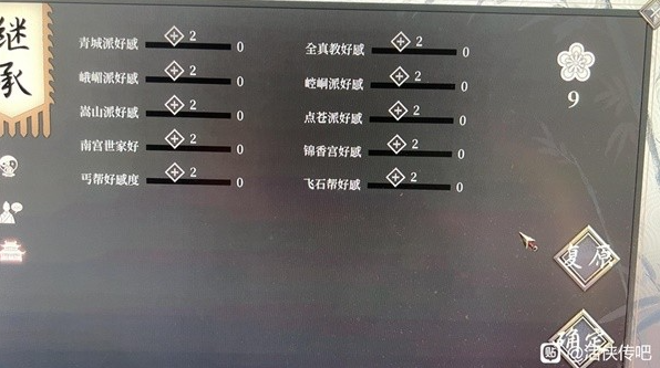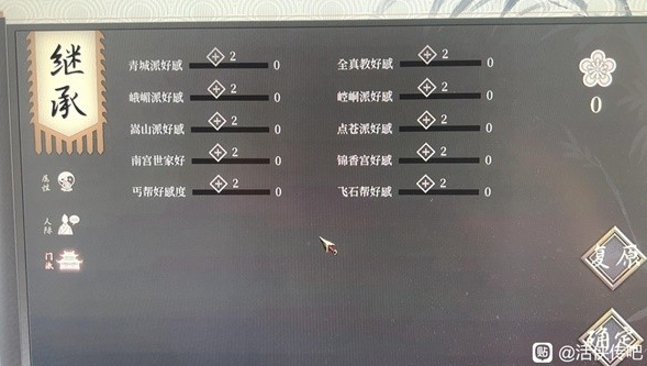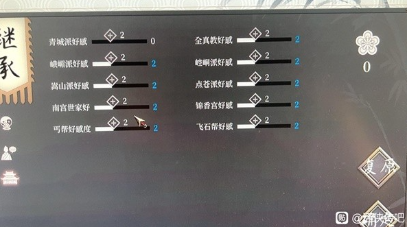1、第二局游戏中,宗派好感度从0点点击1点即可转化为2点好感度;