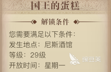 船长的地震列表和经验清单中有许多不同的位置。国王的蛋糕是地中海看到和经历中的第二个故事。这种类型的故事不需要玩家挑战对手或完成困难的任务。他们只需要不断与游戏中的角色交谈即可触发和完成任务。还有几个条件需要满足完成此任务。首先,玩家在游戏中的水平需要达到29级,其次,游戏的打开时间仅为星期一。如果满足这两种情况,玩家可以去地图找到漂亮的小酒馆,目前他们只需要与尼克交谈。