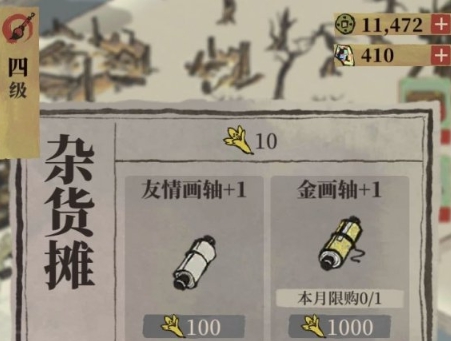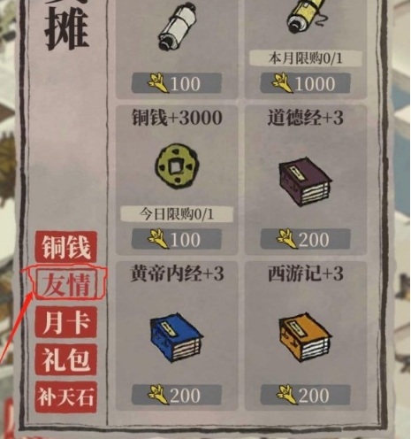 2。友谊点可以在杂货铺的相关物品上交换,其中编辑建议的是限购的金画轴和3000铜钱必买,可以根据玩家的最爱购买其他物品。