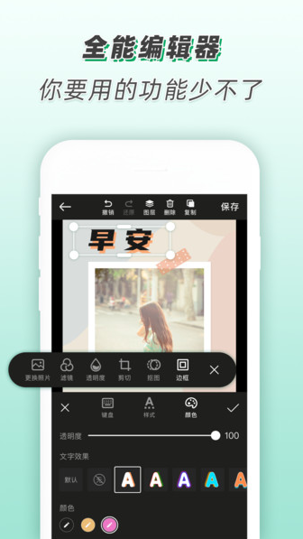 “强大的编辑功能”:支持全新的画板设计,多种特效,多种图文组合风格,支持图片的多种边框和滤镜效果处理
