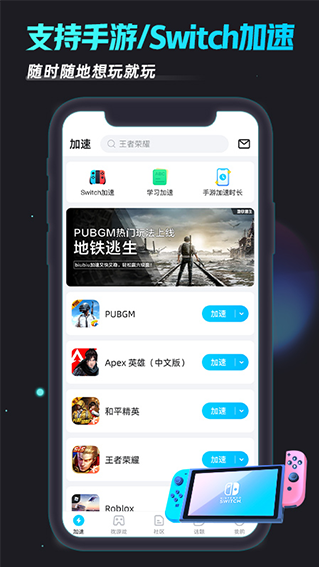 biubiu加速器支持PUBGMOBILE、王者荣耀、和平精英、使命召唤、王牌战士、梦幻西游、第五人格、阴阳师、穿越火线:枪王、堡垒之夜、fgo、暗影诗、公主连接!Re:Dive、闪耀温暖、文明重启、荒野乱斗、七大罪光明与黑暗之战、MyCaf、BTSWORLD、LoveLive!学园偶像祭全明星、游戏王决斗联盟9等热门游戏个人服务器加速!为上千款手游提供一键网络优化加速!