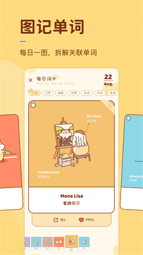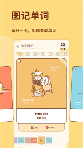 奶酪单词app最新版是一款非常有趣的手机背单词软件。用户可以随时随地在线背单词,为用户提供多种记忆方式,让您学得更熟练,学得更轻松。软件页面设计非常可爱,每个单词解释的都很清楚。用户可以设置桌面小部件,定制专属的单词记忆方案。每当你认真完成单词记忆后,就可以召唤仓鼠兽,用可爱的宠物来战胜懒惰。觉得不错的朋友可以下载哦!