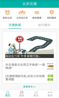 2.在首页可以查看实时公交、公共自行车、综合换乘、实时路况等信息