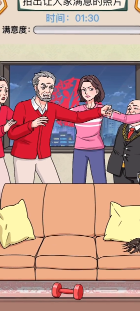 1、先动爸爸,比如把自己的身体向左滑动,把沙发的右扶手向右滑动,把礼盒向上滑动,把礼盒交给爸爸。