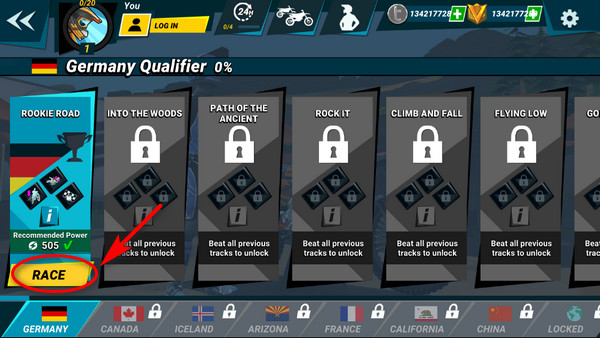 2.进入游戏后,我们首先需要选择赛道,然后按RACE开始匹配对手。
