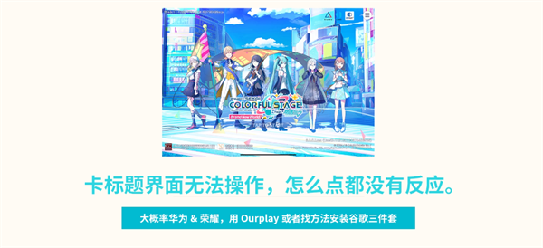 2、卡标题界面无法操作,怎么点都没有反应怎么办?大概率是华为荣耀,用Ourplay或者想办法安装谷歌三件套。