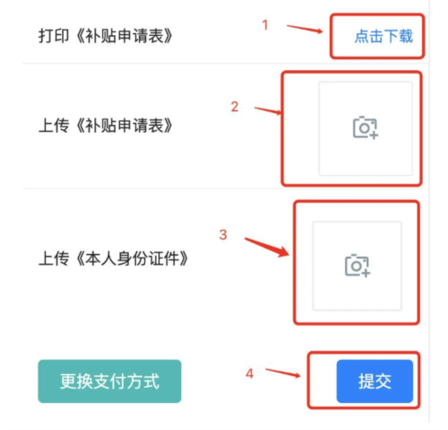 3、点击刷新,等待收据文件生成成功,点击下载《补贴申请表》,打印,签名,点击上传《补贴申请表》,拍照上传,点击上传《本人身份证件》,拍照上传你的身份证。