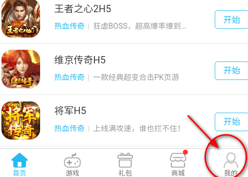 下载安装千百度h5游戏盒子后,打开软件,点击首页我的