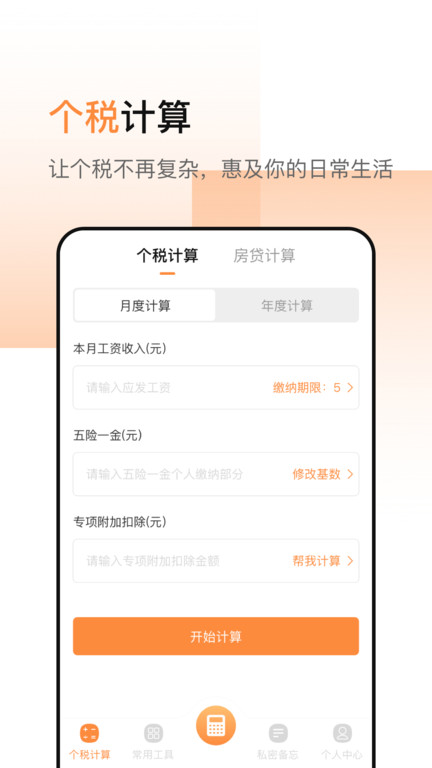 [个人税收计算]输入薪水,五项保险和一项基金以及特殊的附件扣除额,以帮助您一次点击扣除的税收和费用,无论是每月还是年度的,它都可以轻松地帮助您计算薪资收入。选择特殊附件扣除的相应选项,您也可以单击一键进行计算。