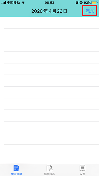 1、首先,打开手机上的小客车摇号APP,在我们的彩票查询界面点击添加,添加彩票人员;