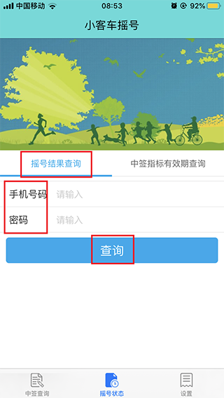 2、在抽奖状态界面,您可以查询抽奖结果,输入您的手机号码和密码,点击查询;