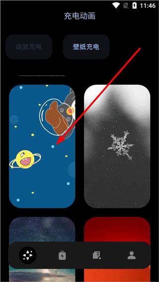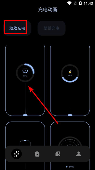 1. 打开小橘充电应用程序。首页可以设置充电动态效果和壁纸。点击其中一种动效进行充能;