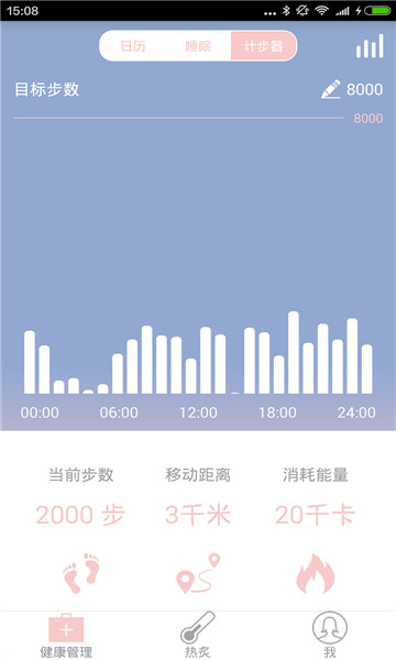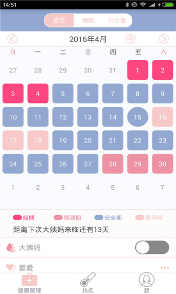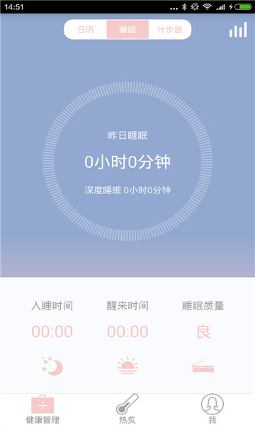 月历:记录本月和以往的月经情况,也可以记录日常生活中的身体状况来记录睡眠和步数统计:连接硬件后