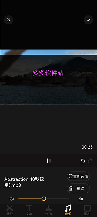 4.除了裁剪功能外,用户还可以对视频进行音乐剪辑、添加滤镜、文字、背景音乐等功能。