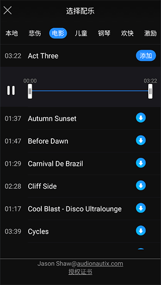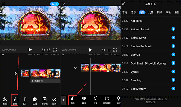 3、选择当前页面下方的【音频】--【音乐】,然后根据自己的需要选择配乐,支持本地音乐选择。