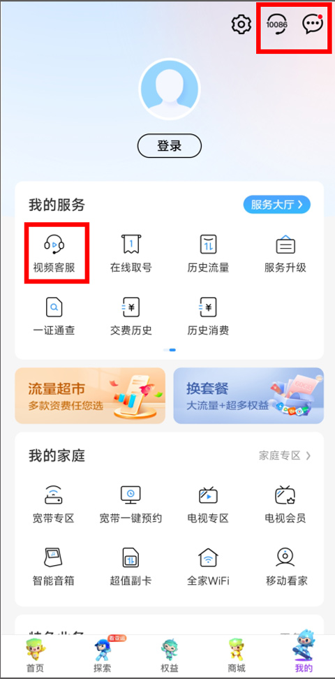 2、在我的页面,用户可以查看我的服务、我的家人以及特殊业务功能版块。用户可以点击我的服务栏目下的视频客服,或者点击右上角的电话客服和留言按钮;
