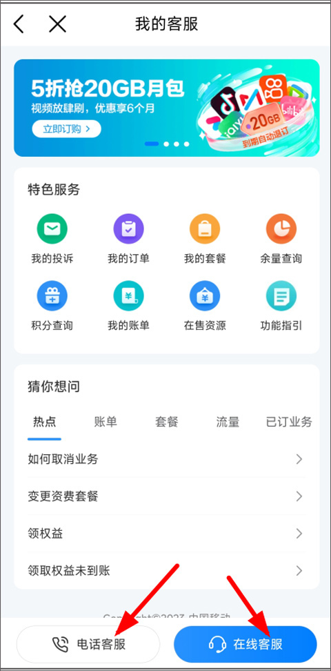 6.进入我的客户服务页面,用户可以选择特色服务,或点击下方的电话客服/在线客服;