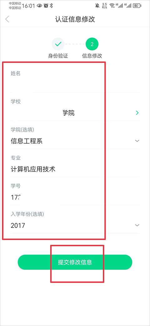 4、最后填写正确的学校名称、学号等信息,点击提交修改信息。